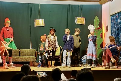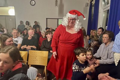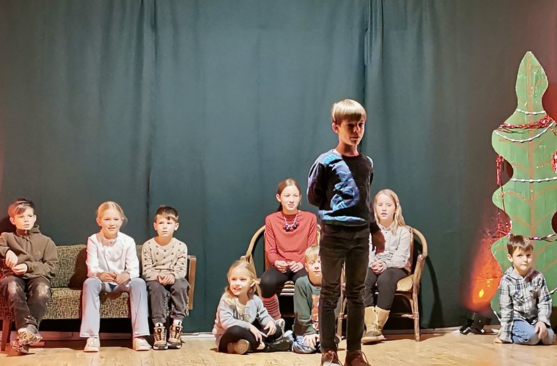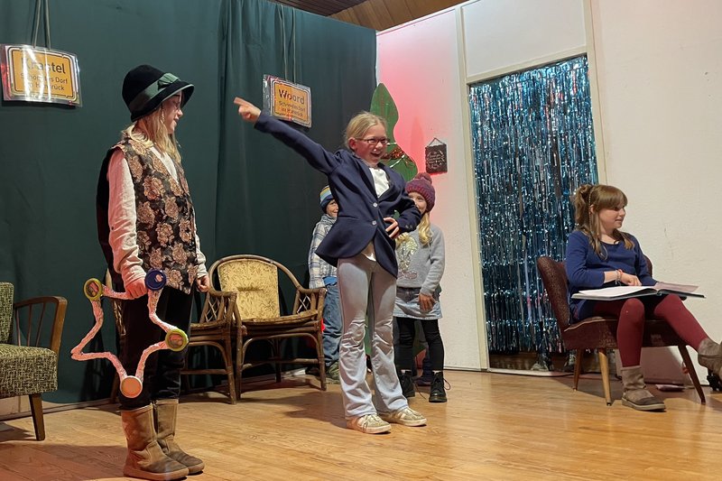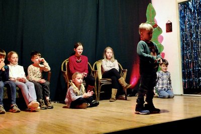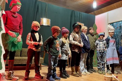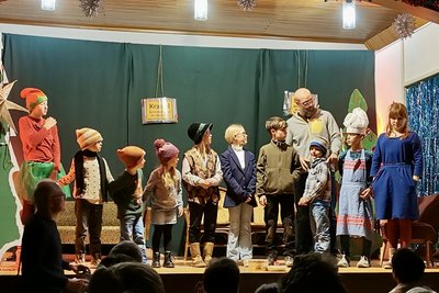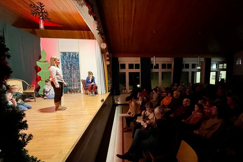 Das Gemeindehaus war bis auf den letzten Platz besetzt, viele Gäste konnten wir auch aus Krastel begrüßen. Die Kleinsten trauten sich mit ihren Gedichten auf die Bretter, die die Welt bedeuten und ein kleines Theaterstück über die Rivalitäten der zwei Dörfer Krastel und Woord rief so manchen Lacher hervor. Jedes Ort beanspruchte für sich das schönste Dorf im Hunsrück zu sein. Das Verschwinden vom Woorder Weihnachtsstern brachte die Menschen aus Woord allerdings in Rage und die Krasteler kamen in Verdacht dahinterzustecken. Diese wiesen allerdings es mit dem Hinweis auf ihren eigenen recycelten Stern zurück. So begann der Sternenstreit und tief im Wald kicherte ein Wichtel über dieses Schauspiel. Denn er hatte den Stern gestohlen und machte sich einen Spaß daraus das Gezänke zu beobachten.