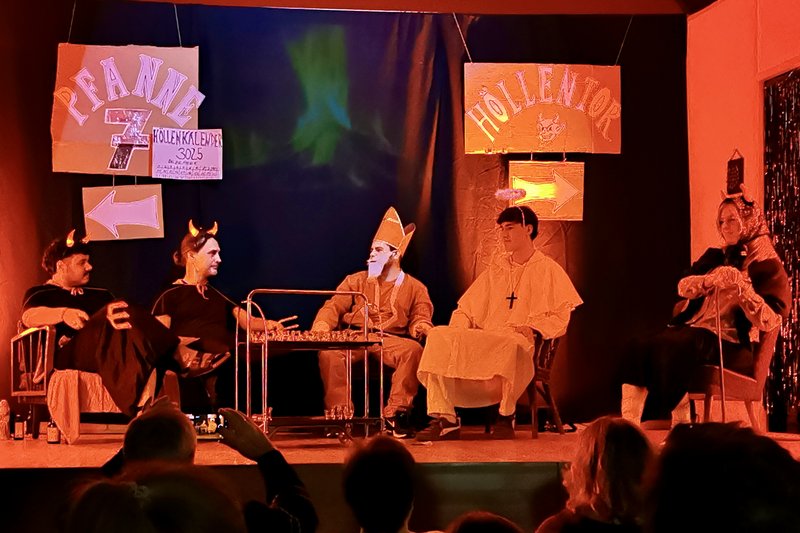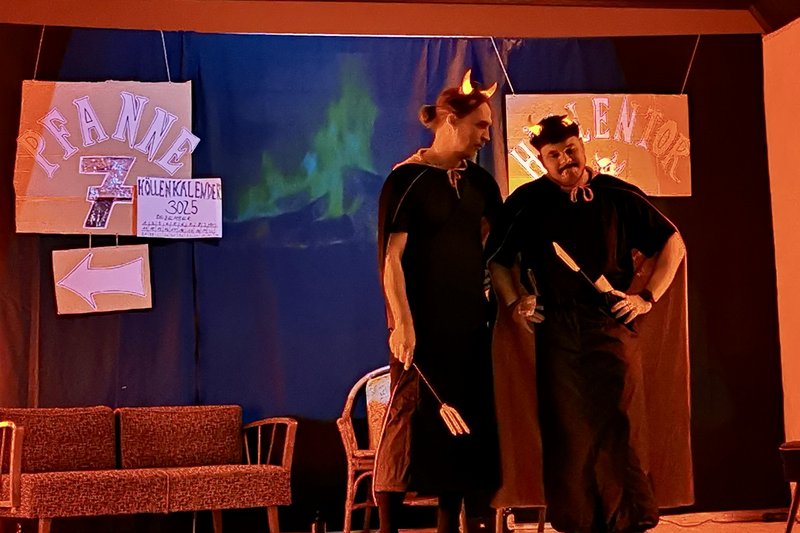 Im Himmel gibt es sehr wenig zu tun, da zu wenig Menschen dort aufgenommen werden können. In der Hölle hingegen sind solche Sorgen vollkommen unbekannt. Dort herrscht Vollbeschäftigung. Der Teufel bittet St. Petrus und den heiligen Nikolaus um Hilfe, denn ihm wurde bekannt, dass sich im Himmel sogenannte Grenzfälle befinden, die eigentlich eher in die Unterwelt gehören. Er möchte diese Leute als Gehilfen gewinnen. Petrus und Nikolaus fahren kurz vor Weihnachten mit dem Aufzug runter zur Hölle, um mit dem Teufel ein „Dienstgespräch“ zu führen. Dieser erweist sich entgegen aller Erwartungen als äußerst empathisch, gastfreundlich und zuvorkommend. Der Versuch mit drei Zeitgenossen als Gehilfen des Teufels entwickelt sich zu einem turbulenten Spektakel. Es gibt keine nur himmlische oder nur höllische Menschenkinder. In jedem steckt etwas, mal mehr, mal weniger. Das Publikum war auf jeden Fall begeistert und sparte nicht mit Applaus.