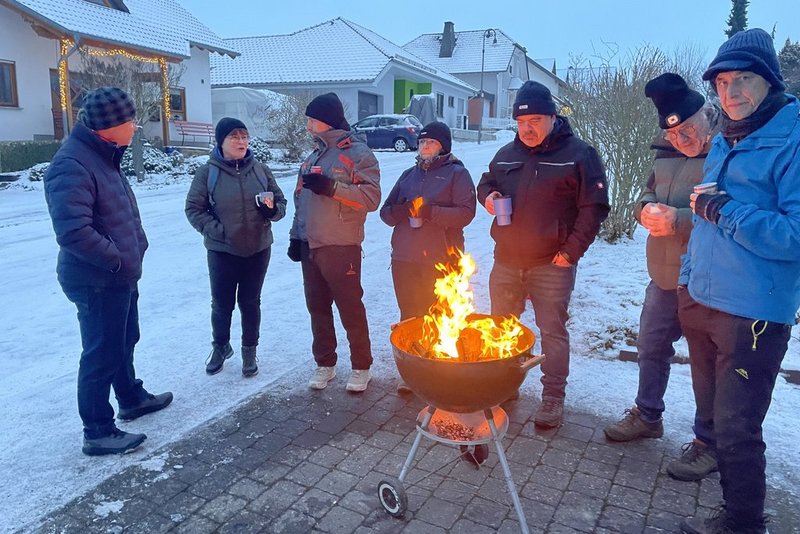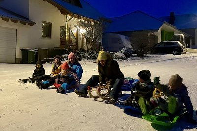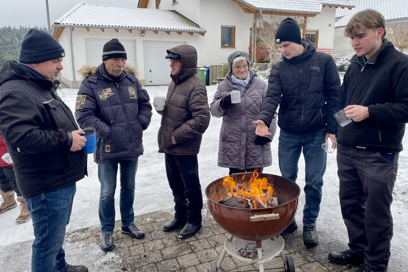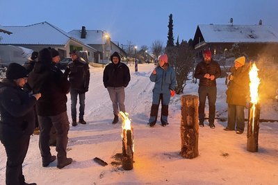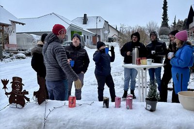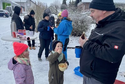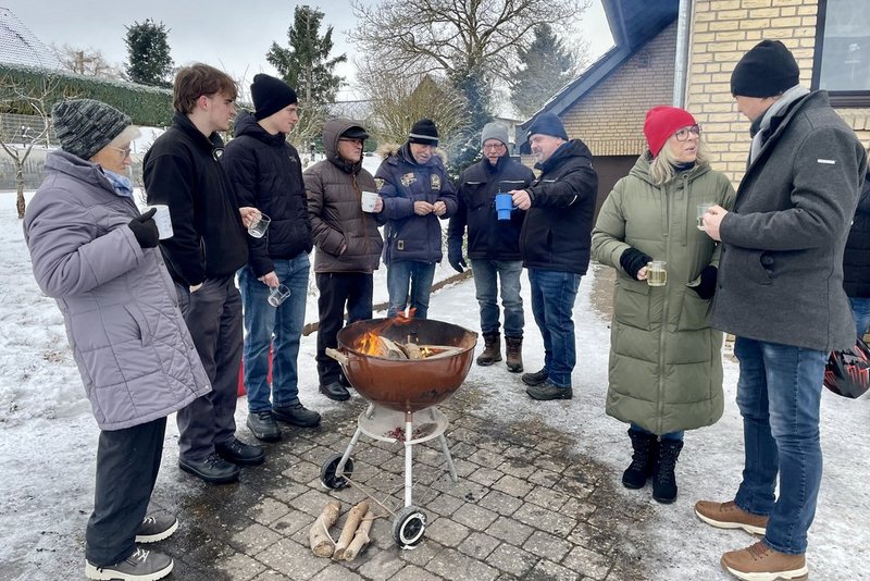 Schlag ½ vier trudelten die ersten Gäste ein. Der Glühweinduft aus dem heißen Bottich versprach einen angenehm wärmenden Genuss. Nun mal sehen was sich so alles einfindet. Die Becher füllten und leerten sich, ob der Glühwein ausreicht? Schnell mal noch Reserve her, da waren doch noch weitere 12 Flaschen in dem Regal? Langsam legte sich die Dämmerung über die Hillerswies. Kinder mit ihren Schlitten nutzten den festgefahrenen Schnee auf der Straße. Alle bei bester Laune. Knisternt brennende Schwedenfeuer erhellten die Runde und wärmten nun auch von außen. Für innen gab es dafür ja Becher mit dampfendem Glühwein. Eine angenehme Atmosphäre, warum nicht auch am kommenden Sonntag. Reserve ist noch genug da. Gesagt getan.