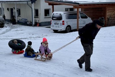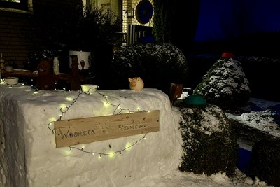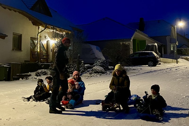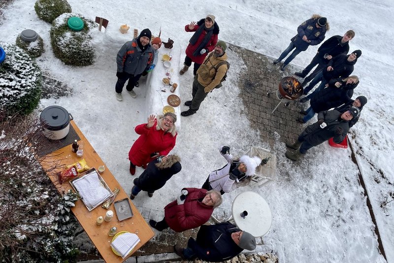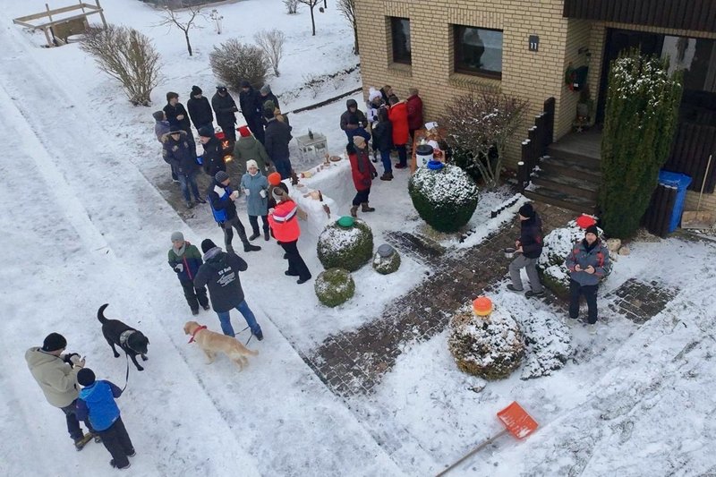 Samstag morgen, in der Nacht ist Schnee gefallen. Der bleibt jetzt wohl hoffentlich mal ein wenig liegen. Also raus ins Freie um zu sehen was zu machen ist. Die zwei Nachbarjungs wuselten schon rum. Erster Sicht- und akustischer Kontakt, was machen wir mit dem Schnee? Wegschaufeln ist einfach zu öde. Wie wärs es mit einer Schneebar, sprudelt es aus Carlo heraus. Reicht dafür der Schnee? Da kommt Nachbar Heiko mit seinem Quad um die Ecke. Bewaffnet mit einem Schneeräumschild schob er die Bürgersteige frei, unsre Rettung. Alles was so rechts und links der Straße an Schnee rumlag und er dessen habhaft werden konnte, verfrachtete er zu der Hillerswies 11. Jetzt galt es die Bar auch unseren Gästen schick darzubieten. Gerade oder im Winkel und wie aufbauen? Ein Schalungsrahmen war sogleich die richtige Lösung. Matteo als Schneeherbeischaffer und Carlo als Schalungsmeister bewährten sich bestens. Bald war die Schneebar hergerichtet. Derweil sorgte Lucia für die Einladung der Gäste über WhatsApp. Im Feuerwehrraum standen noch einige Kartons weißer Glühwein, ordentlich nebeneinander gereiht, also werden mal gleich 12 Flaschen für uns gebunkert.