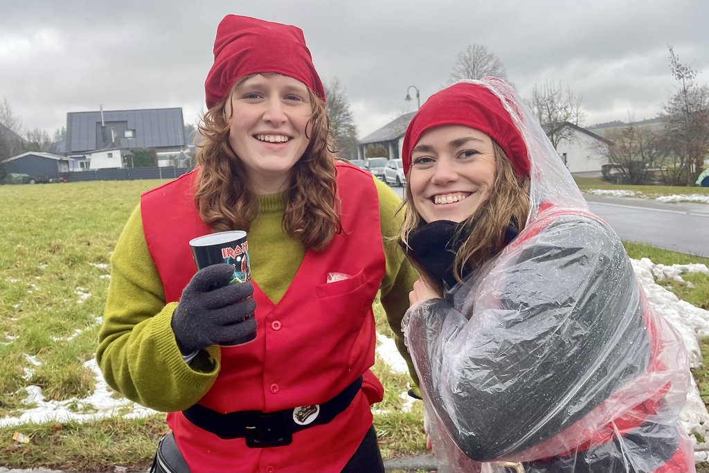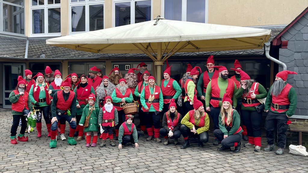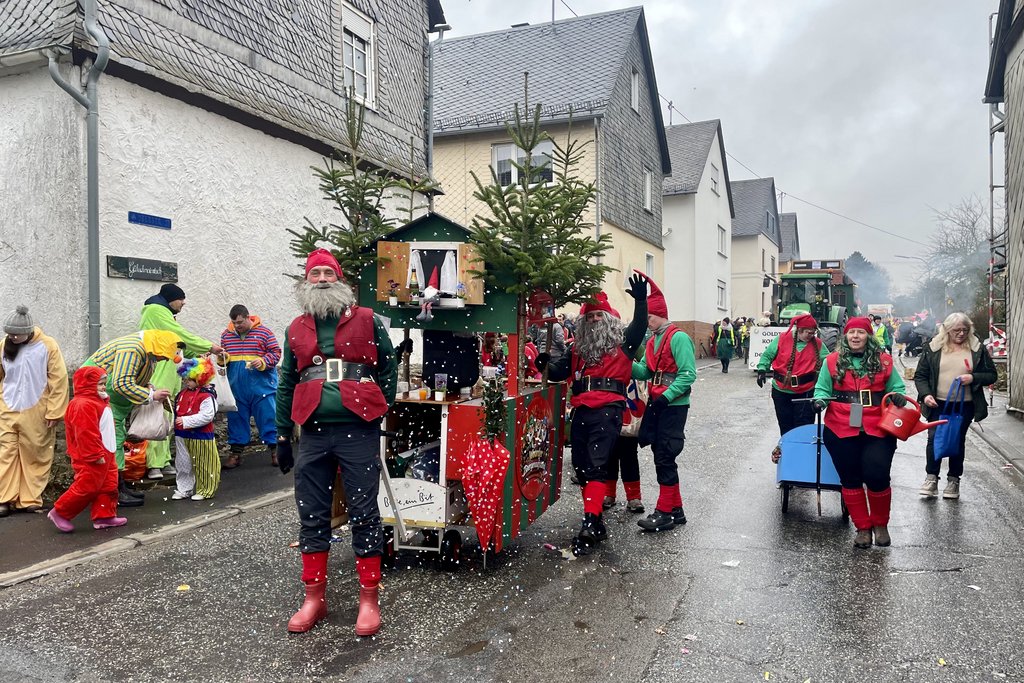 Diesmal lockte auch der Rosenmontagszug in Beltheim und diese Freude wollten wir dem Beldemer Mädche Nicole dann auch machen. Zwar waren wir nur mit halber Zwergenstärke angetreten, aber die Helaurufe waren umso kräftiger. Auch ließen wir uns nicht vom kalten Nieselregen abhalten, richtige Narren müssen da durch. Am Ziel angelangt waren die Bottiche mit Kamellen und sonstigem geplündert, die Flüssignahrung aufgebraucht."