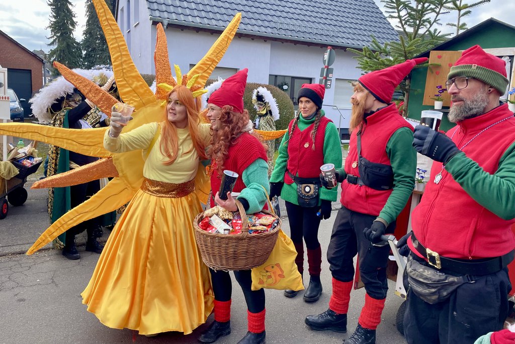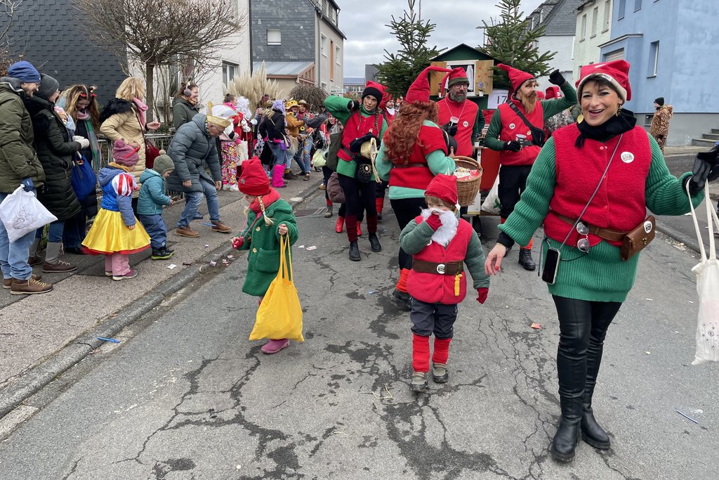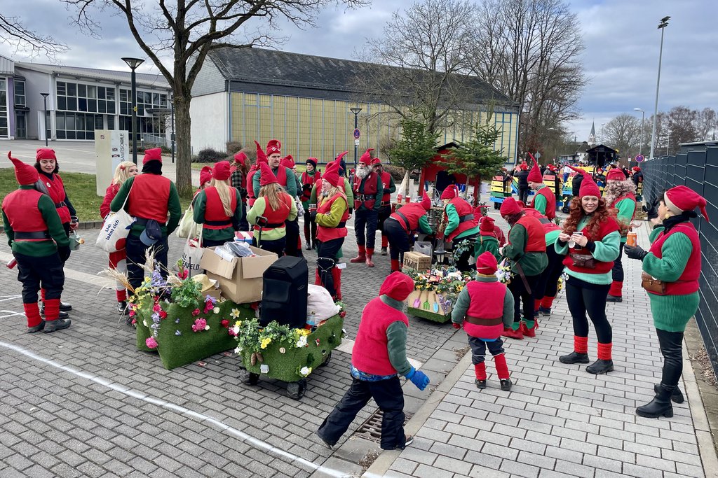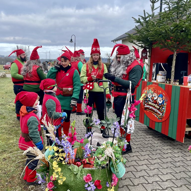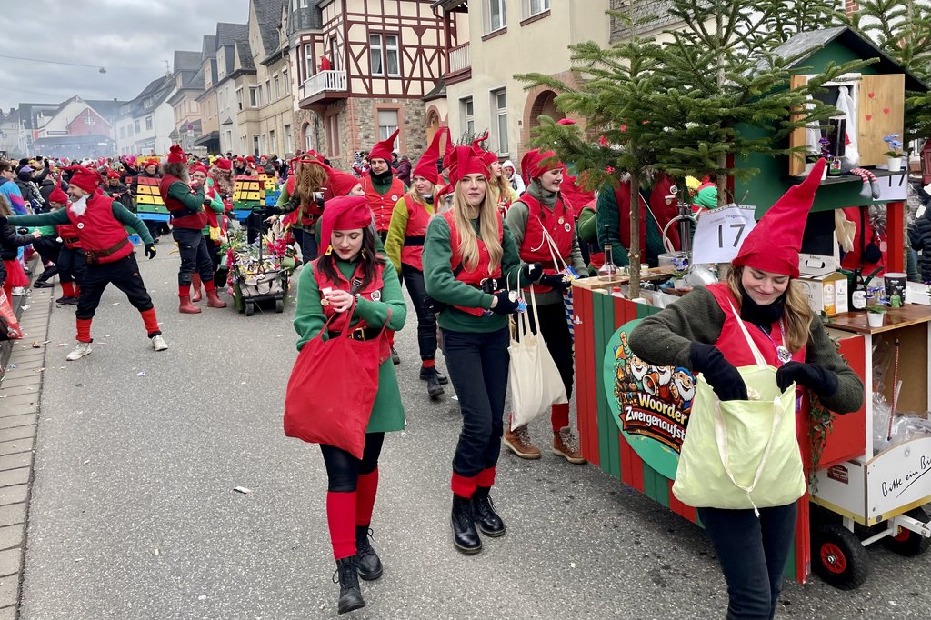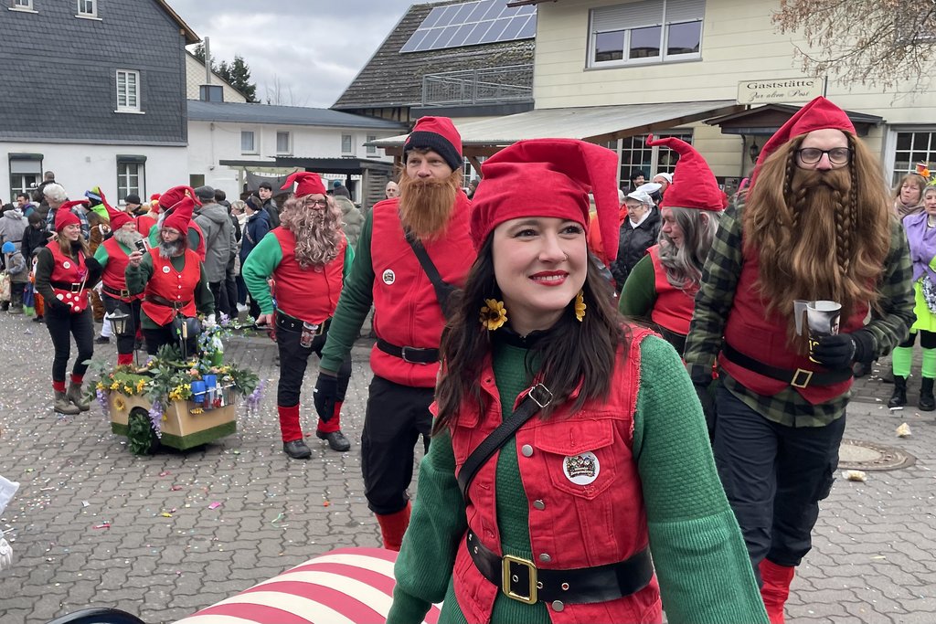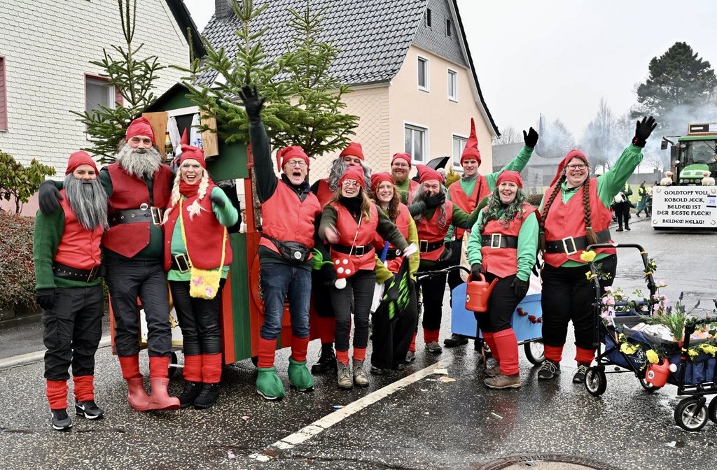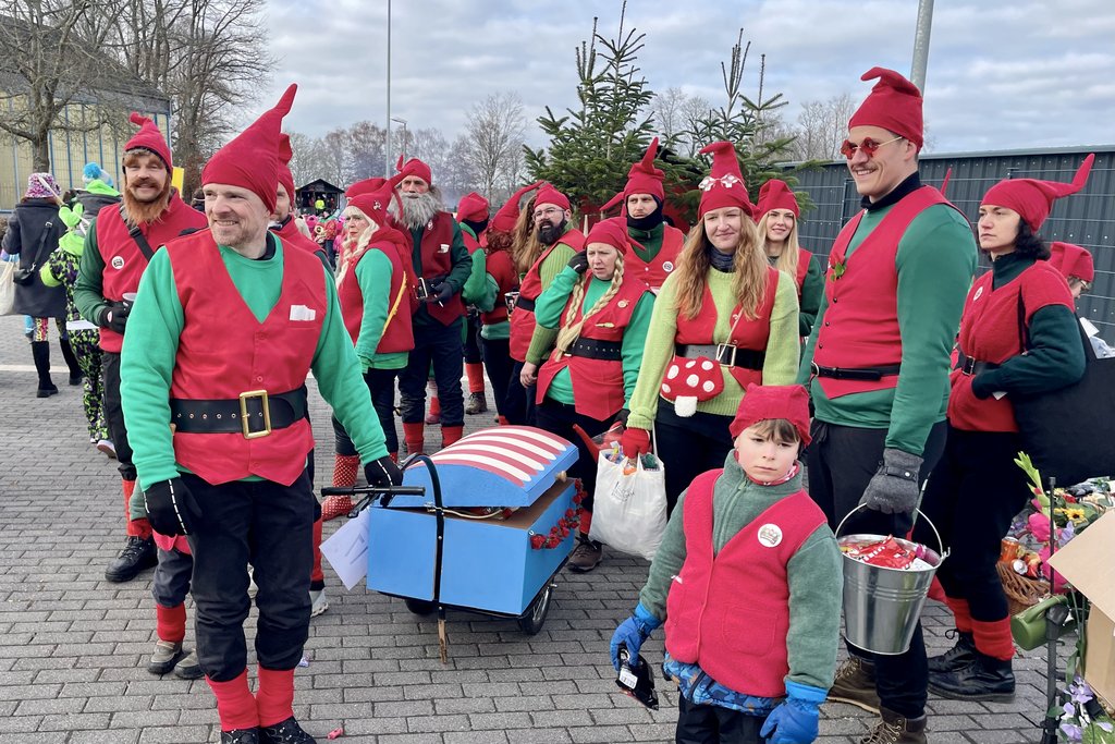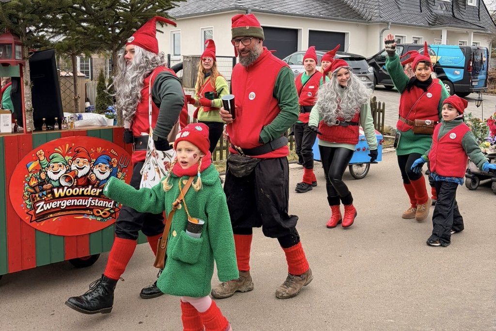 Der Woorder Zwergenaufstand zeigte sich aber von seiner freundlichen Seite. Aufstand ja, aber nett, freundlich und immer mit einem Helau auf den Lippen. Mehr als dreißig rote Zipfelmützen machten sich auf den Weg um die Narrenschar zu begrüßen. Mit reichlich Wurfmaterial und Flüssignahrung konnten die Zuschauer rechts und links der närrischen Wege beglückt werden.