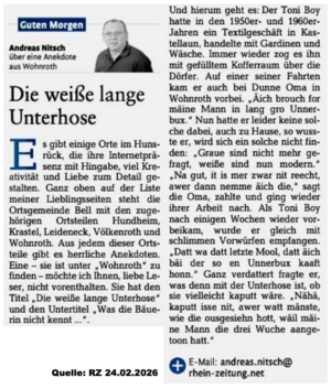 Als Toni Boy nach einigen Wochen wieder vorbeikam, wurde er gleich mit schlimmen Vorwürfen empfangen. „Datt wa datt letzte Mool, datt äich bäi der so en Unnerbux kaaft honn.“ Ganz verdattert fragte er was denn mit der Unterhose ist, ob sie vielleicht kaputt wäre.